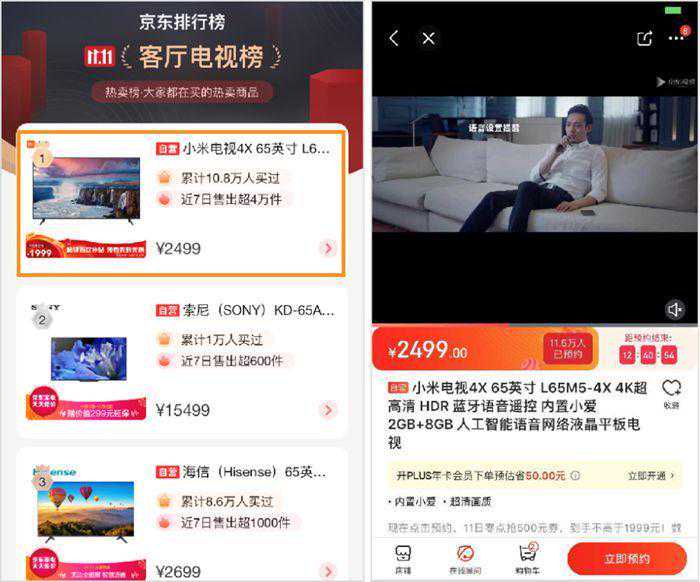 说起电视,也是大家电中不得不提的品类之一。小米、海信、TCL占据电视销售额排行榜的前三甲。而位居榜首的小米,在卧室电视榜、客厅电视榜、小户型客厅电视榜、品质大屏电视榜等细分领域均取得优异成绩。仅以小米4X65英寸客厅专属电视为例,这款4K超高清,可以蓝牙语音遥控并且内置小爱的人工智能语音网络液晶平板电视近七日就售出超4万件,累积10.8万人购买过此款电视。与此同时,还有11.5万人已经成功预约,坐等11.11当日将其纳入麾下!