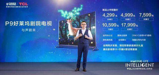 TCLP9好莱坞剧院电视,2020年春季首发5个尺寸段新品,其中50吋售价4299元,55吋售4999元,65吋仅售7999元,75吋售10599元,82吋仅售17999元,在超大屏尺寸段其价格极具杀伤力。