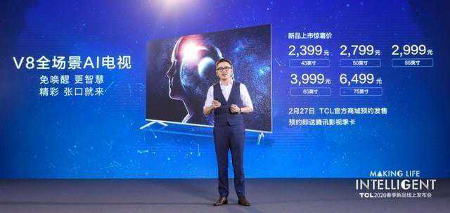 TCLV8全场景AI电视全场景AI电视也正式开启了全网同步预约发售,拥有五个尺寸段,分别为43吋售价2399元,50吋售价2799元,55吋售价2999元,65吋售价3999元,75吋售价6499元。