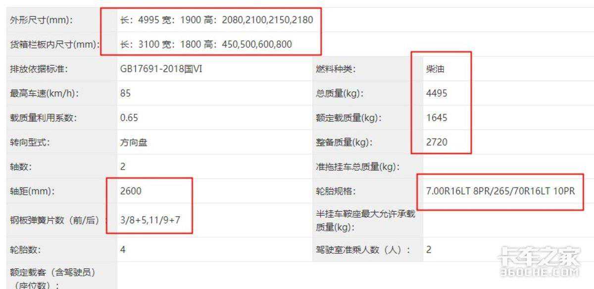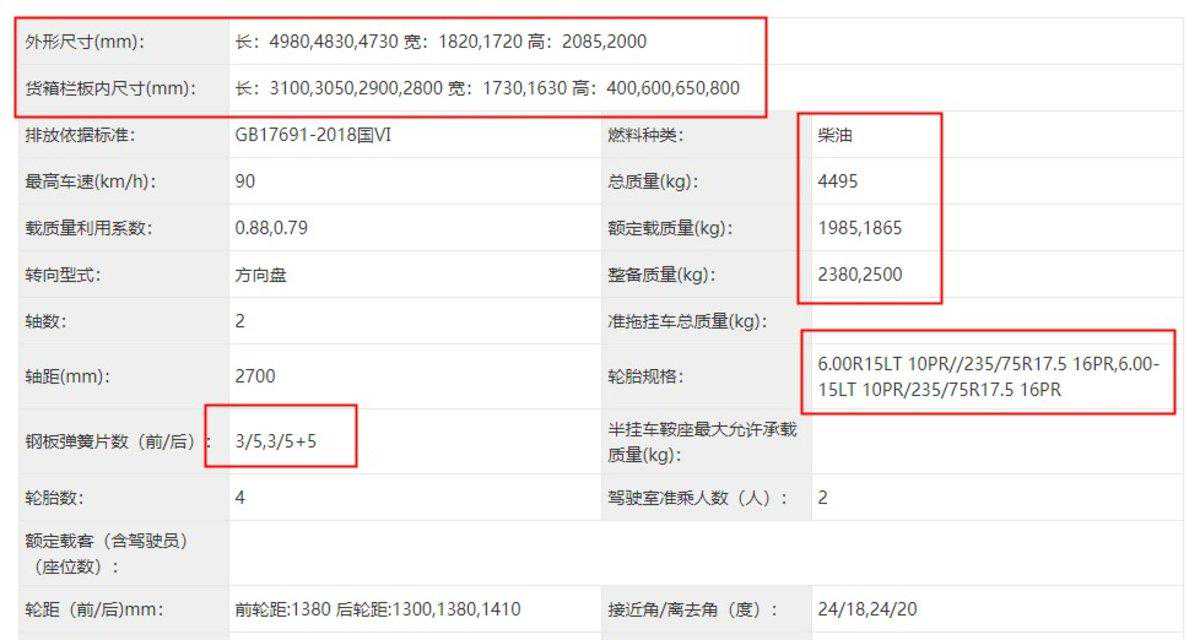 此次,福田小金刚公示的产品仍然比较多,有汽油和柴油两种动力,按照驾驶室又有单排、排半以及双排多款驾驶室。首先来看柴油动力产品,无论是单排还是双排、排半驾驶室,三款产品的货厢内宽都为1800mm,总质量也都是4.495吨,板簧数量为8/8+5,后单胎则是6.00R15LT10PR/235/75规格。