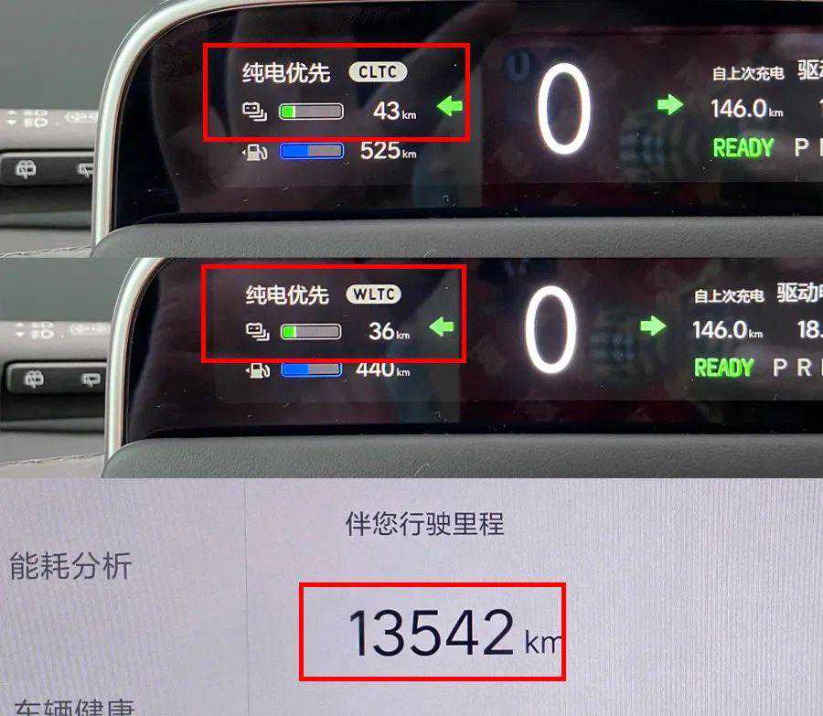 我们这辆车搭载了一块40.9千瓦时宁德时代三元锂电池,比L9的锂电池要小一些,CLTC纯电续航里程标称210公里,WLTC纯电续航里程168公里。在北京市区实测,最高气温30℃。充满100%电后,CLTC模式下表显续航里程为210公里,WLTC模式下表显续航里程为175公里;实际行驶了147公里后,CLTC模式下表显续航减少167公里;WLTC模式下表显续航减少了139公里。因此,CLTC模式表显准确率为88.02%,WLTC模式表显准确率为105.76%。如果按照CTLC标准,预估满电能跑210公里,标称里程获得率达到87.50%。