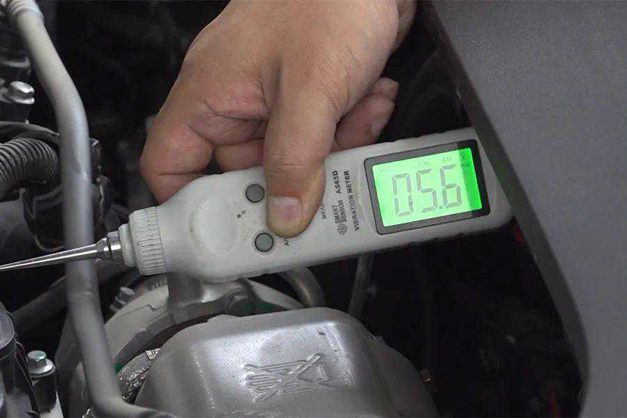 测试方法:水温正常后,关掉空调,在怠速状态下,使用测振仪垂直曲轴方向,将探针接触发动机金属机体中间的最高位置,测量发动机振动加速度值,数值越低,表明振动越小。