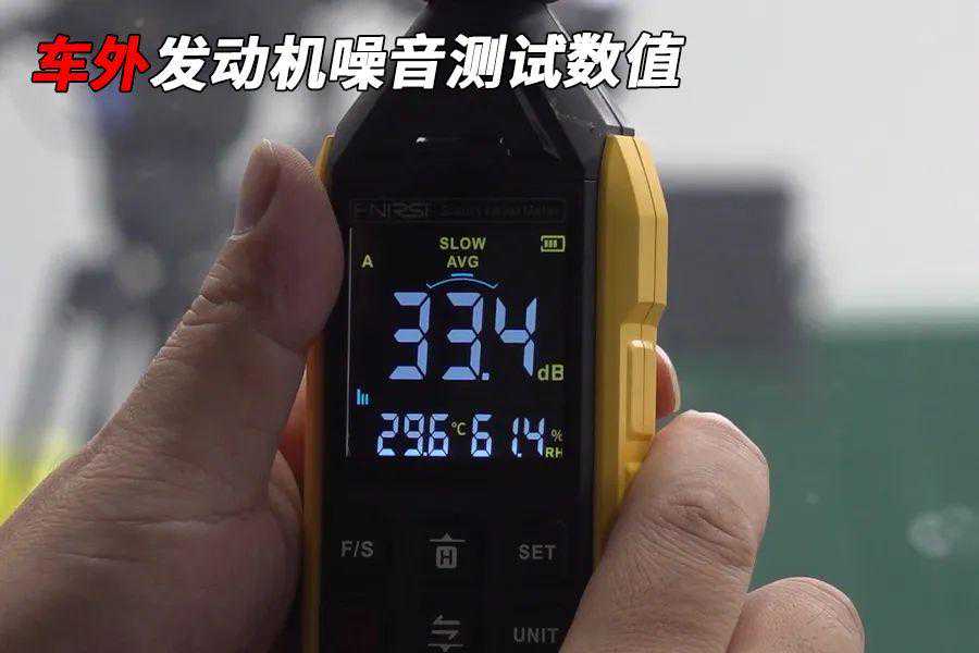 这辆车的发动机只是一个增程器,所以我们测试发动机怠速噪音值。车外的发动机怠速噪音为62.8dBa,车内的发动机怠速噪音为33.4dBa。这辆车对于发动机噪音的控制还不错。