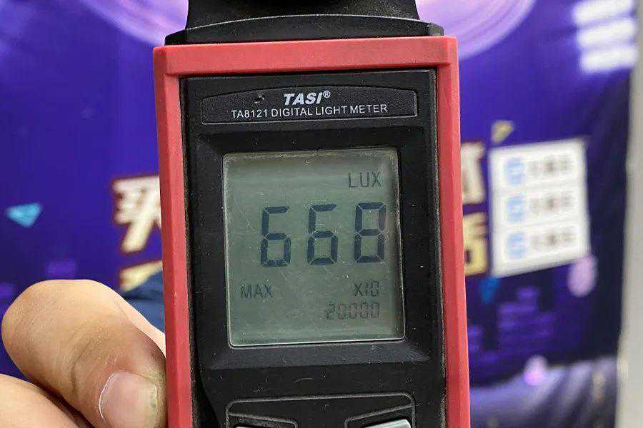 测试方法:以车灯最前端为基点,与垂直墙面相距2米距离,在发动机正常工作状态下进行测试,使用光线照度计取近光灯照明范围内的最大值。