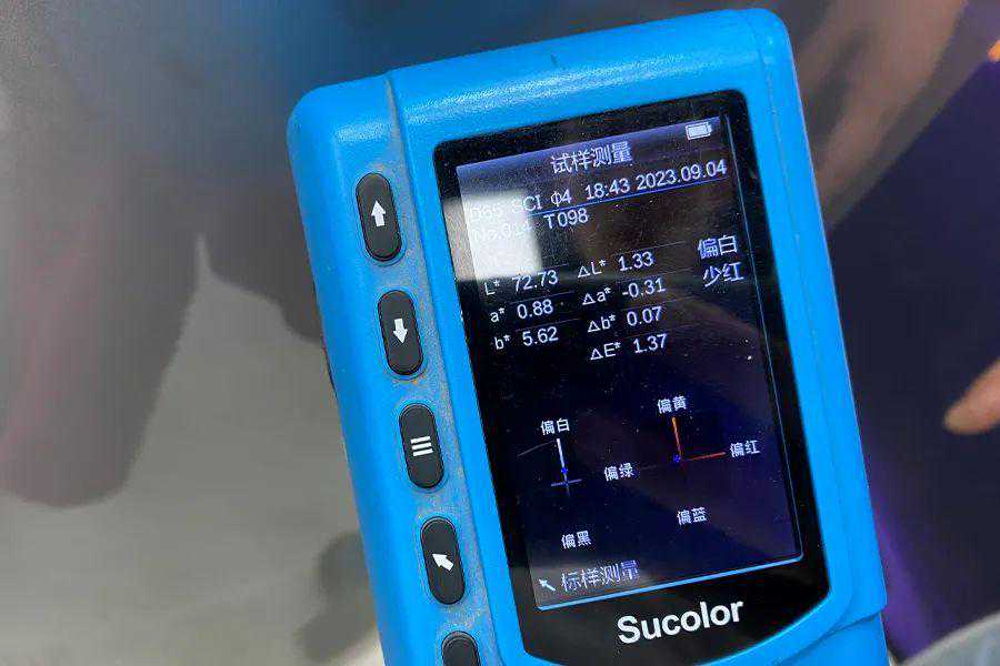 经过测试,最大色差值位于后保险杠处,色差值为1.37ΔE,比基准点偏白少红。从数值上来看,这辆车的喷漆工艺质量控制还可以。
