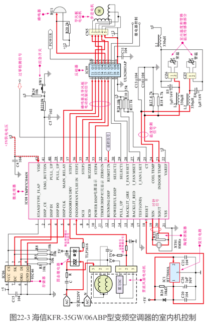图22-3为海信KFR-35GW/06ABP型变频空调器的室内机控制电路原理图。该电路是以微处理器IC08(TMP87CH46N)为核心的自动控制电路。