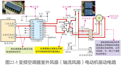 .图22-5为该变频空调器室外风扇(轴流风扇)电动机驱动电路。从图中可以看出,室外机微处理器U02向反相器U01(ULN2003A)输送驱动信号,该信号从①、⑥脚送入反相中。反相器接收驱动信号后,控制继电器RY02和RY04导通或截止。通过控制继电器的导通截止,从而控制室外风扇电动机的转动速度,使风扇实现低速、中速和高速的转换。电动机的启动绕组接有启动电容。