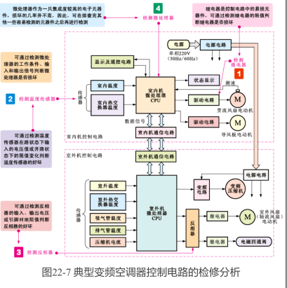 可以看到,变频空调器室内外机的控制电路要是由微处理器、存储器、晶体、复位电路、继电器、反相器以及各种功能部件接口等组成的。