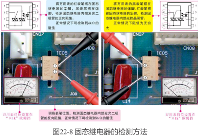 结合前面我们了解固态继电器的内部结构,判断固态继电器的性能,可通过检测发光二_极管端和晶闸管端阻值的方法判断好坏,如图22-8所示。
