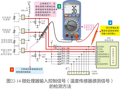 微处理器正常工作需要向微处理器输入相应的控制信号,其中主要包括温度检测信号(室内机部分还包括遥控信号)。若经上述检测微处理器的工作条件能够满足,而微处理器输出异常时,还需要对微处理器输入的控制信号进行检测。微处理器输入控制信号(温度传感器感测信号)的检测方法如图22-14所示。