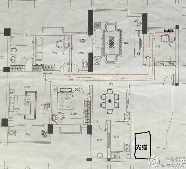 这就是现在家里面有线网络的布局图了(用win10自带的画图画的网线,大家将就着看吧)装修的时候对网络还不是很了解。用的线是装修公司帮忙买的,说是当时比较好的,3块钱/米,看了一下应该是超五类屏蔽线后悔当初没有上六类线啊!!!