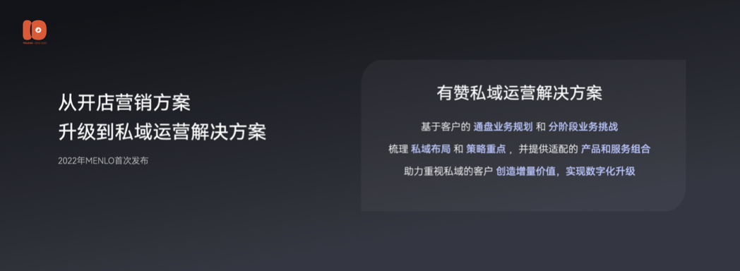 在今年有赞MENLO发布会上,我们首次对外发布,从「开店营销解决方案」,升级到「私域运营解决方案」。过去,「开店营销解决方案」是以私域商城生意为中心,通过产品配置帮助客户完成私域商城的搭建和开业营销。现在,「私域运营解决方案」则是以客户通盘生意为中心,通过业务调研去梳理客户的通盘业务规划和分阶段业务挑战,策划客户的起盘方案,并匹配与此架构对应的产品组合方案。