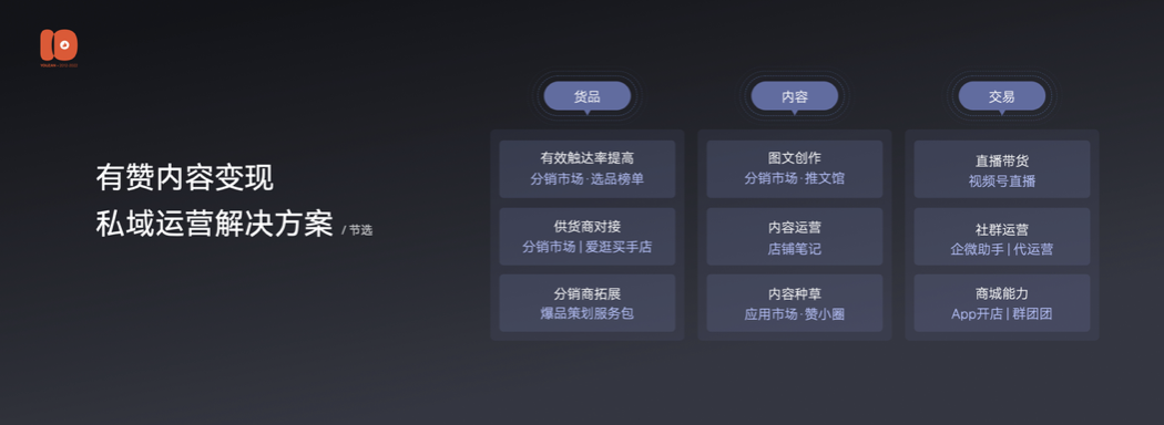 之所以有赞团队能够深入其中,不仅是这10年的私域探索,积累下来了,SaaS标品、行业能力、系统定制等数字化产品与服务;还有对公私域联运的认知、顶层落地、数字化构建,MVP的选定与跑通,以及增长复制的陪跑带教能力,也希望能和各位商家朋友们共探共知。