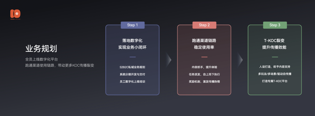 第二阶段的重点在于验证和跑通MVP,开展模式共创跑通线上线上私域沉淀与互动机制、渠道/门店/导购赋能链路、基础的变现价值等业务模型,拉动企业内部上下游共创协作,赋能团队精益执行。