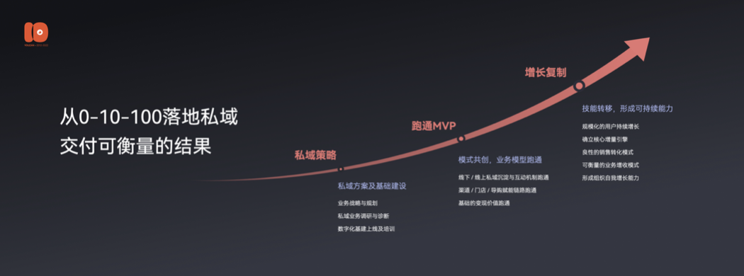 在助力企业从0到1到10到100的私域落地执行的过程中,有赞强调与客户联创,跨越周期平衡成本、风险与效率,将私域落地分为了三个成长阶段,力求每个阶段的交付结果可衡量,助力企业形成可持续发展的能力。