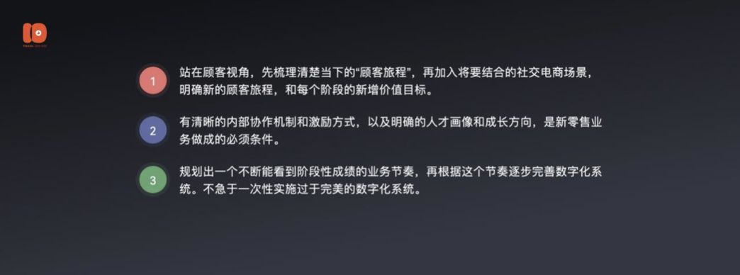 1.拉上你们公司最核心的智力资源,一起认认真真开一次“私域业务/新零售业务规划会”。会议的核心主题是:站在顾客视角,先梳理清楚当下的“顾客旅程”,再加入将要结合的社交电商场景,明确新的顾客旅程,和每个阶段的新增价值目标。从怎么获得客户,怎么转化客户,怎么留住客户,客户在整个生命周期如何继续贡献的,怎么给你带来客户的,以及客户下单之后到门店的体验如何,如何履约、如何做客户服务,建议都要全部梳理,并且梳理清楚下一个阶段如何优化旅程中的体验,每个阶段的新增加值是什么。如果需要,有赞的客户成功专家和我们的咨询专家们,可以参与进去陪伴大家一起做。因为这将成为未来你们私域和新零售业务的真正行动纲领。