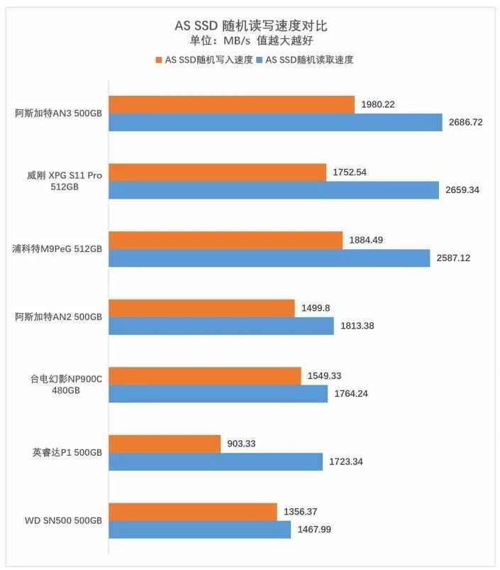 在ASSSD随机读写测试对比中,采用慧荣SM2262EN主控的阿斯加特AN3500GB/威刚XPGS11Pro512GB和Marvell88SS1093主控的浦科特M9PeG512GB随机读取速度达到了2500MB/s以上,充分展示了八通道主控的性能实力。而在上文中编辑提到WDSN500500GB采用的是通道,跑出了和英睿达P1500GB、台电幻影NP900C480GB、阿斯加特AN2500GB相差并不多的成绩,可见闪迪的自有主控和原厂闪存颗粒的实力。同时,在这项测试中,没有外置缓存的阿斯加特AN2500GB4K写入速度表现也还是不错的。