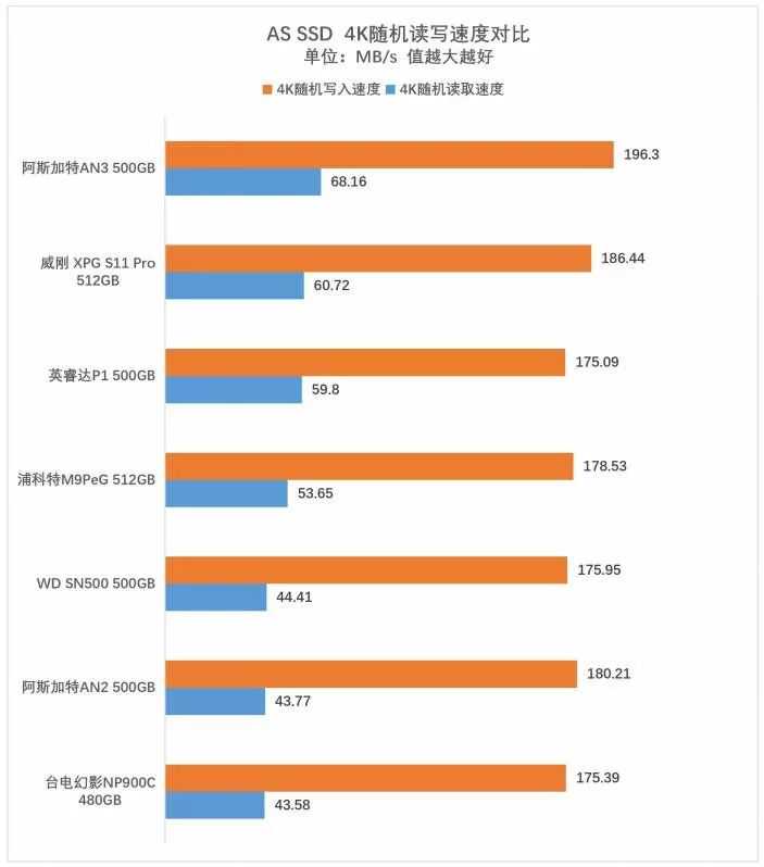 在4K随机速度对比测试中,阿斯加特AN3500GB表现不错,4K随机写入速度高达196.3MB/s,4K随机读取速度也达到68.16MB/s.其中不带外置缓存的阿斯加特AN2500GB表现也不赖,4K随机写入达到了180MB/s以上,充分说明它在应对零散文件写入时的高效率。