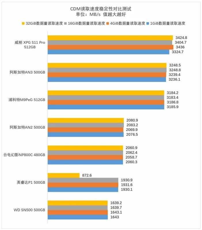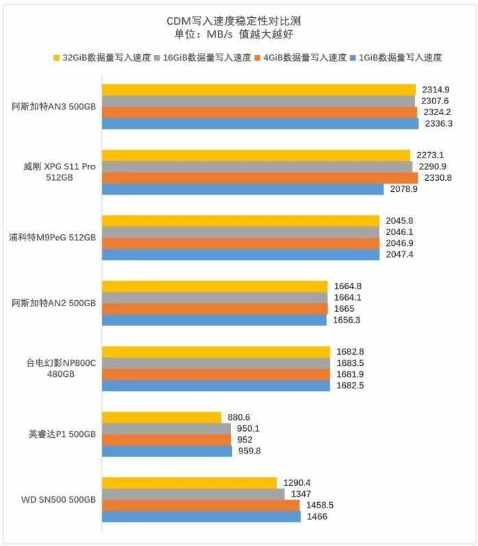 你要是想要性能和预算兼顾,阿斯加特AN3500GB和威刚XPGS11Pro512GB的表现可圈可点。在各项对比测试中,这两款产品都采用了慧荣SM2262EN主控,这款主控在今年被大多数品牌选取采用,重点是在性能和成本上都很靠谱。在这次对比中,阿斯加特AN3500GB和威刚XPGS11Pro512GB一直很稳定,不同数据量写入情况下能维持高效稳定的传输,实际应用中也不存在掉速。关键是,价格上也并没有贵得很离谱。尤其是阿斯加特AN3500G的电商报价仅499元,相当给力。
