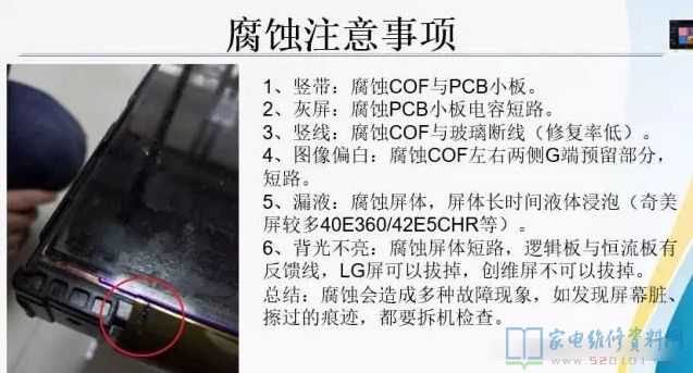 此故障一般为进液体腐蚀或逻辑板坏造成LG屏较多,遇到此故障需拆机检查是否进液体导致。(左侧密集竖线处可能腐蚀造成屏体断线,修复率低。)
