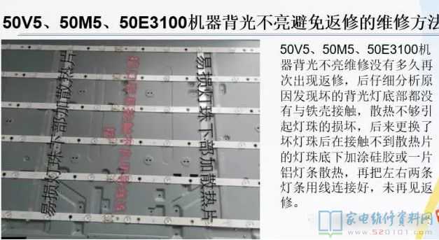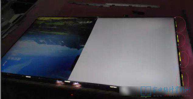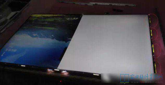 故障分析:此故障为灯条未贴紧散热板导致灯条鼓起导光板烧坏,出现此故障只能是维修灯条并更换导光板