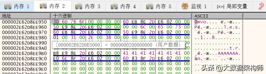 信息泄露获取JVM基址由上文可知,Unsafe提供了堆外内存的分配能力,这里的堆并不是OS层面的堆,而是Java层面的堆,无论是Unsafe分配的堆外地址,还是Java的堆内地址,其都在OS层的堆空间内。经过分析发现,在通过Unsafe分配一个很小的堆外空间时,这个堆外空间的前后内存中,存在大量的指针,而这些指针中,有一些指针指向jvm的地址空间。