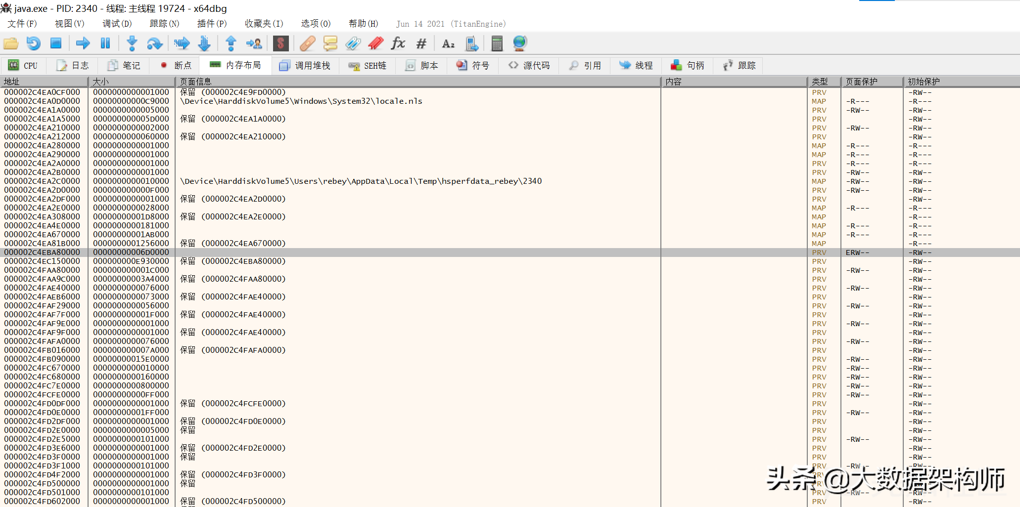 上文的POC中我们已经可以劫持RIP,但是我们的shellcode部署在堆上,不方便通过ROP关闭DEP。那能不能找一块rwx的内存呢?熟悉浏览器漏洞挖掘的朋友都知道JIT区域天生RWE,而Java也是有JIT特性的,通过分析进程内存布局,可以看到Java进程确实也存在这样一个区域,如下图: