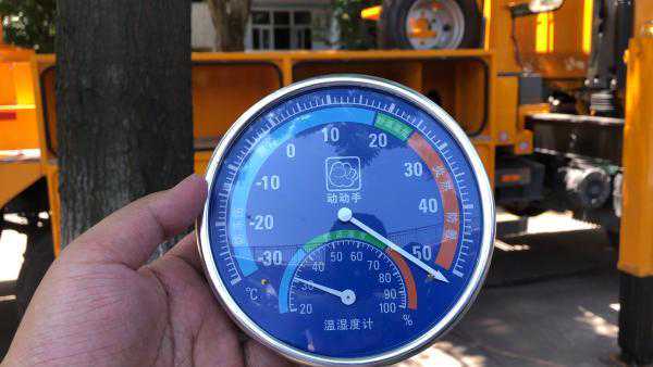 斗臂车内的温度计已爆表,李胜祖在空中作业时,温度已超过了50摄氏度,加上厚重的绝缘服,“透不过气来”。