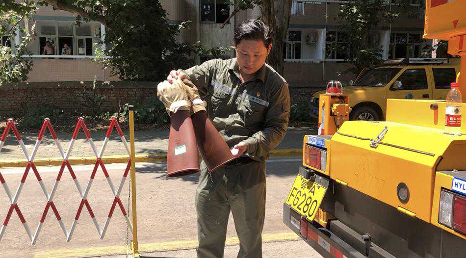 26日上午9时许,武汉气温已达37摄氏度,带电作业班来到故障点进行作业,准备工作就绪后,两名主要操作人员李胜祖和彭军穿上厚重的绝缘服,带好硅橡胶手套、防护镜,登上绝缘斗臂车,分别将3大块绝缘毯用夹子固定在斗臂车一侧。