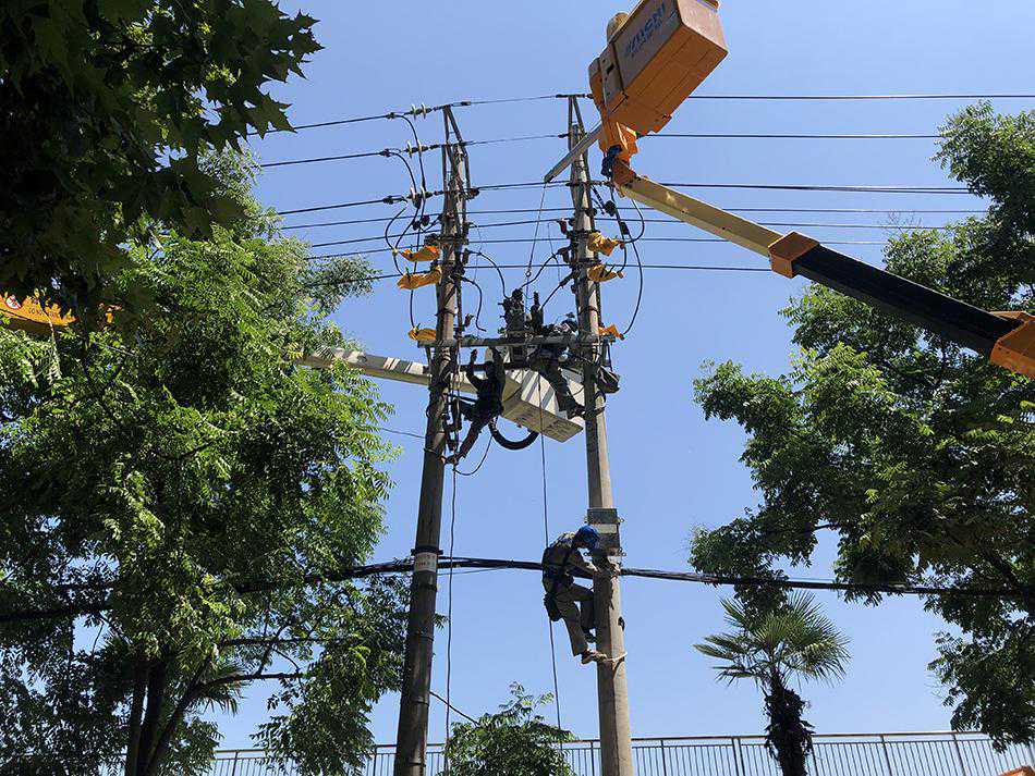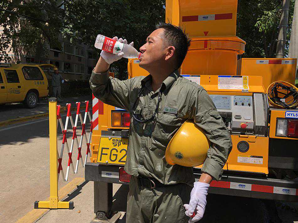 还未正式作业,李胜祖的后背早已汗湿,猛灌下一瓶矿泉水后,李胜祖开始操作绝缘斗臂车,升至10余米高操作面,拧螺丝、拆下故障开关。随后,三名电工脚踩脚扣,爬上线杆,配合将故障开关运下并安装控制箱。