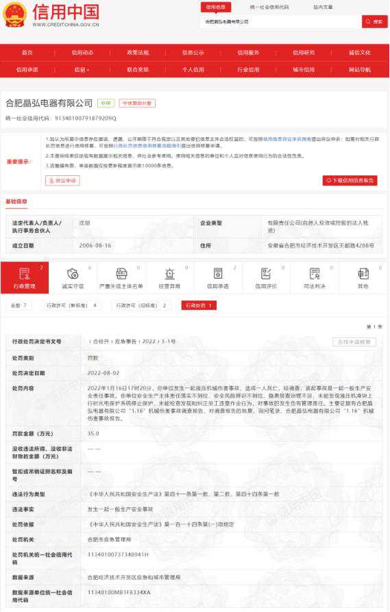 中国经济网北京8月17近日,信用中国网站公布的行政处罚决定书(﹝合经开﹞应急事告﹝2022﹞3-1号)显示,合肥晶弘电器有限公司因发生一起一般生产安全事故,被合肥市应急管理局罚款35万元。2022年1......
