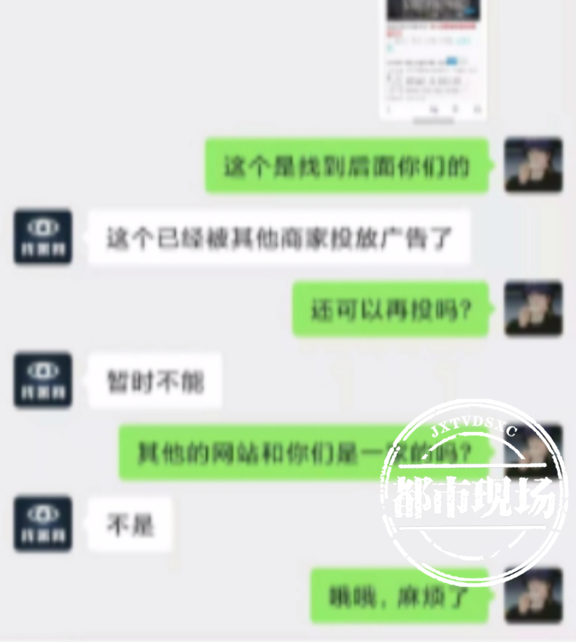客服人员通过记者的好友申请后,通过微信表示,他们这家网站南昌区域的广告位已经被其他商家投放了广告,暂时不接受新广告。