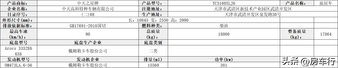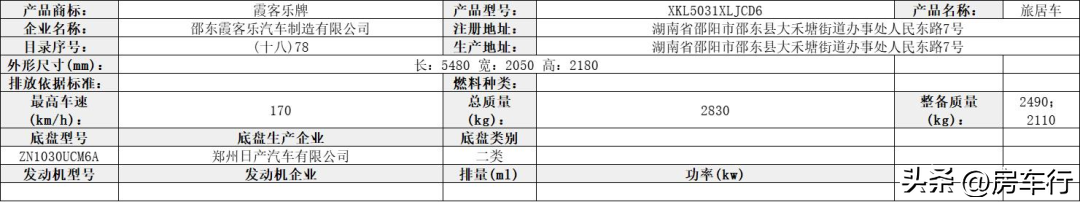 该车设有桌椅,睡具、炊具、卫生设施及必要的照明和空气调节等设施和液晶屏,影音设备等旅居生活娱乐专用装置,用于旅行宿营,该车选装ETC车载装置;该车以裙边结构作为侧、后防护;发动机最大净功率为101kw。