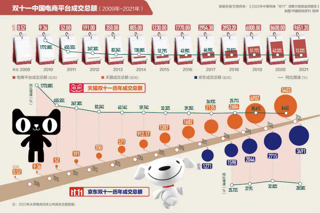 “从2009年到2011年,这个阶段是探索阶段。等到京东开始参与到双十一中,标志着双十一成为一个真正意义上所有电商的狂欢。”谢璞说。