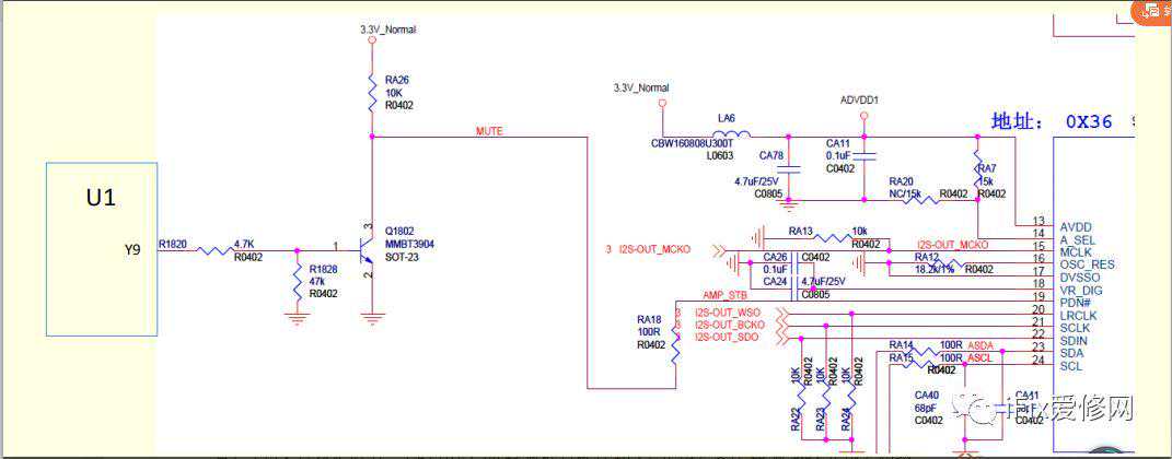 重点查2、3、34、35、40、41、44、45脚供电12V有,13、27脚3.3V有,输出端却为0.4V左右,不对!应该是供电一半的电压。测19脚静音脚有1.7V,正常,复位25脚3.3V正常,总线23、24脚3.3V正常,15脚主时钟输入1.7V,20脚0.9V,21、22脚都为1.7V,这三个脚为信号输入脚。