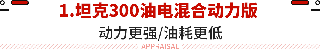 第一款是坦克300HEV,它是坦克300的油电混合动力版,最早于今年成都车展正式亮相。新车最大亮点是搭载由2.0T米勒循环发动机和9HAT变速箱组成的油电混合动力系统,系统综合功率305马力,峰值扭矩640牛·米,百公里加速时间预计在9秒以内,官方宣称其WLTC工况综合油耗相比燃油版车型节省25%,换算下来油耗不到8L/100km。