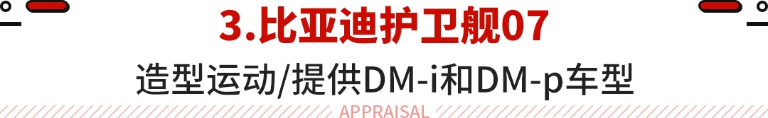 第三款比亚迪护卫舰07,它是比亚迪海洋网首款SUV车型,定位中型SUV,新车并将提供DM-i车型和DM-p车型。在2022年8月成都车展上,比亚迪护卫舰07就已经公布了预售价,预售价区间为22-28万元,基本与比亚迪唐新能源相近。