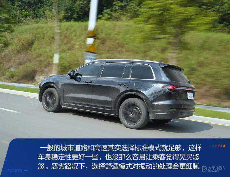 理想ONE的悬架有舒适和标准两种模式可选,对应的是阻尼可变减振器的调节。一般的城市道路和高速其实选择标准模式就足够,这样车身稳定性更好一些,也没那么容易让乘客觉得晃晃悠悠。如果路面质量较为一般的话,选择舒适模式对振动的处理感会细腻一些。