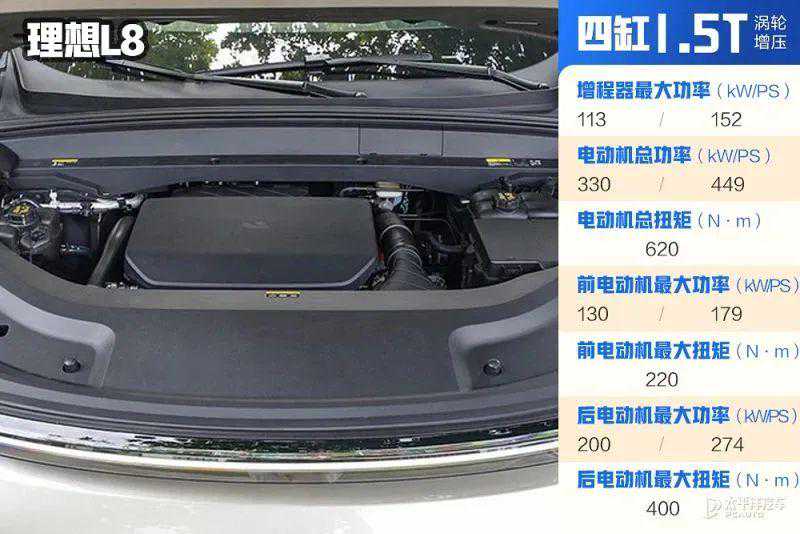 理想L8搭载了自研自产的1.5T四缸全米勒循环发动机作为增程器,最大功率为113kW,热效率达到40.5%,燃油优先模式下CLTC工况油耗为5.9L/100km。驱动方面配备智能四驱系统,前驱动电机最大功率130kW,后驱动电机最大功率200kW,整车总功率达到330kW,扭矩达到620N·m。