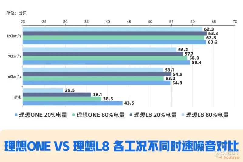 作为增程式车型,咱们测试噪音就需要更多不同工况的测试,除了常规的怠速、60km/h、90km/h和120km/h之外,还有分别测试20%电量(增程器保持工作)和80%(低速度时,增程器不工作),在不同速度下的噪音水平。