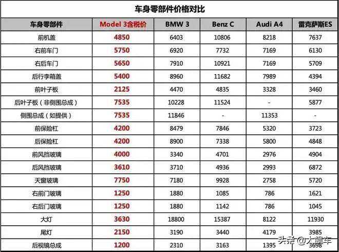 除了维保项目价格,另外也有一份关于特斯拉售后维修所需的零部件的价格表曝光。与传统传统豪华品牌BBA相比,特斯拉的价格明显低了一大截。