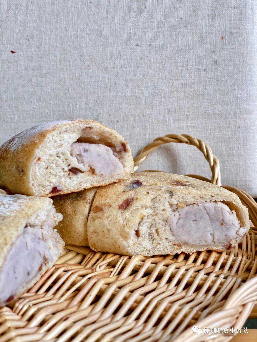 最招牌的香芋系列,被最多人推荐的就是这款香芋相恋,拿到手中胖嘟嘟,很有分量感,切开则可看到几乎要爆出的芋泥馅,包身上夹了蔓越莓,整体甜甜又糯糯也太治愈了。