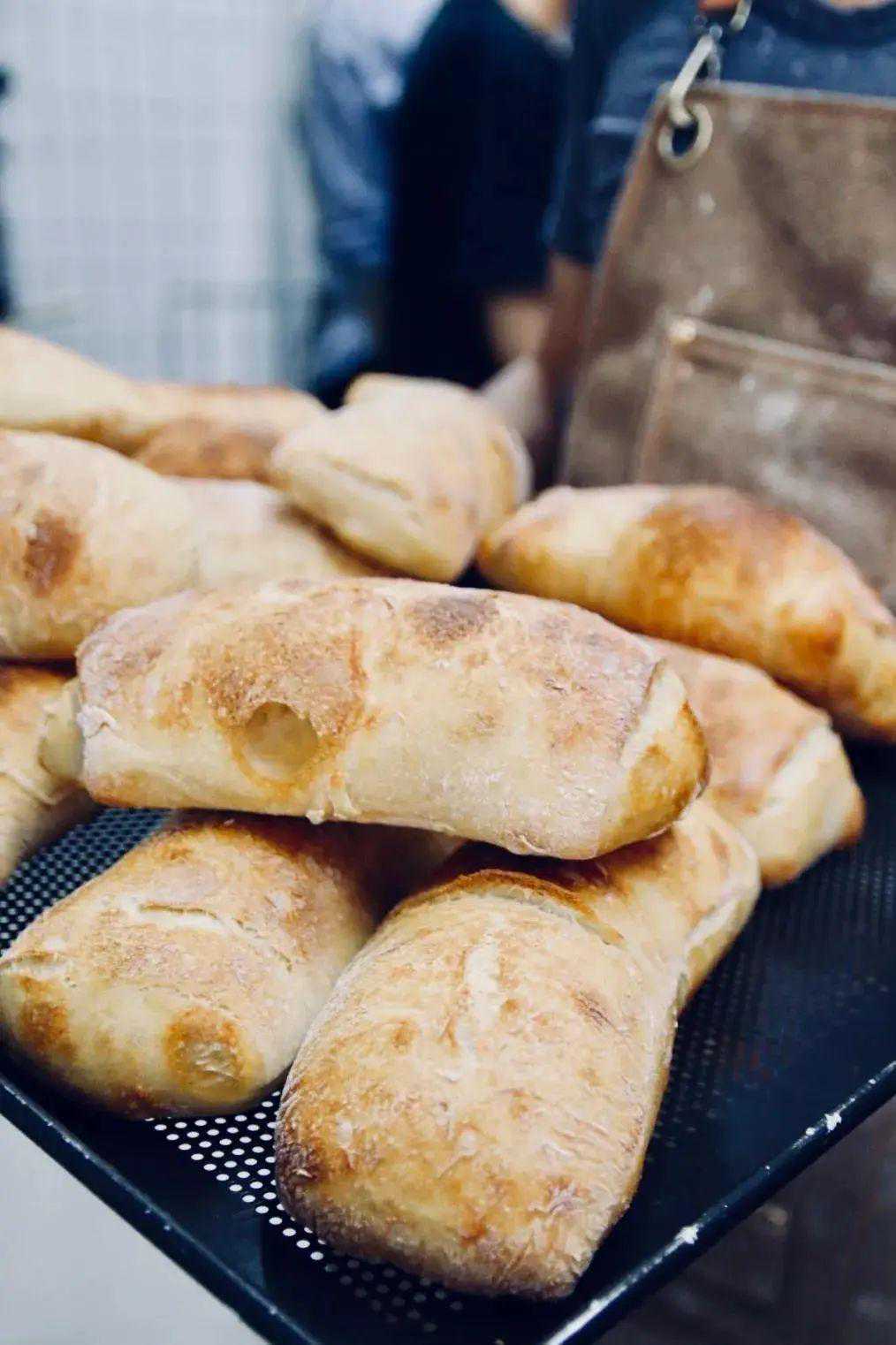 面包大体可以分为2类,rich系面包和lean系面包,前者大多用到黄油起酥,馅料丰富,口感松软;后者则仅使用粉类、水、盐、酵母四种原料,展现谷物本身风味。而店里的招牌Ciabbata夏巴塔,正是lean系面包的代表。