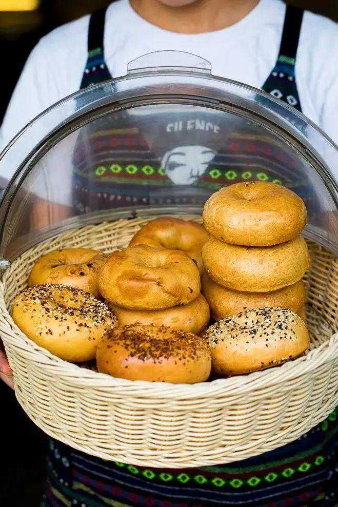 这间小店在深圳贝果圈小有名气。二战前贝果是一款流行于欧洲的面包,后来被带入北美,成了美国人的最爱。贝果也是唯一需要烤前水煮的面包,这道工序封住了面团中的水分,将蓬松柔软的口感变得富有嚼劲。