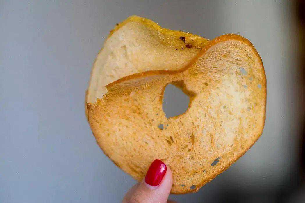 店里的贝果有18款口味,但对于有些人来说口味还是单调,便会选择加酱或加料的吃法。店里比较经典的搭配,贝果+烟熏三文鱼+水瓜柳+洋葱丝,1个50来块。还有熟客都会打包的烤贝果片可以试试。