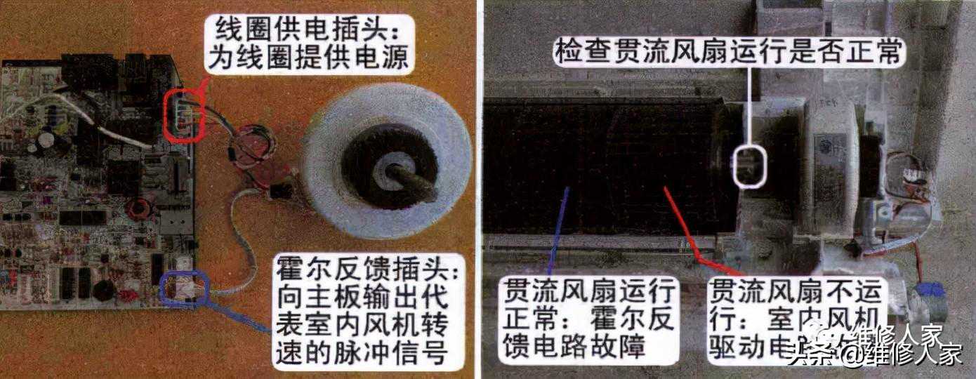 ⑥室内机主板CPU接收不到室内风机输出的霍尔信号后,故障现象根据空调器厂家不同而不同,如某些型号的空调器10s后即停止室内风机供电,同时关断压缩机和室外风机供电;如格力空调器则表现为10s后室内机主板输出交流220V电压驱动室内风机运行在最高速,并持续50s,仍接收不到霍尔信号则停止室内风机、压缩机、室外风机等负载的供电,室内风机的运行过程则持续1min。