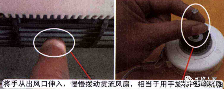 遥控器关机但不拔下空调器电源插头,室内风机停止运行,即空调器处于待机状态,将手从出风口伸入,并慢慢拨动贯流风扇,相当于慢慢旋转PG电机轴。