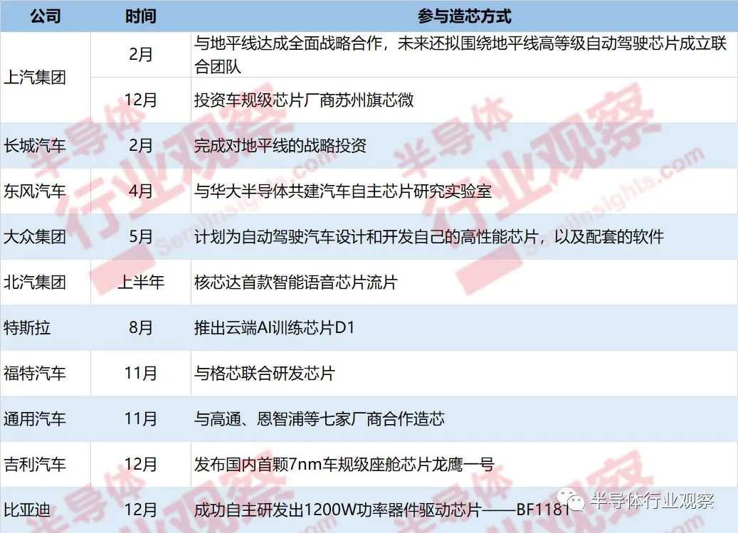 除了比亚迪外,特斯拉、北汽、大众、吉利等也属于“自研芯片”队伍。其中,北汽产投与Imagination集团、翠微股份合资成立的核芯达首款智能语音芯片于今年上半年流片;特斯拉8月份推出云端AI训练芯片D1;吉利汽车12月份发布国内首颗7nm车规级座舱芯片龙鹰一号。大众集团则是在5月份表示计划为自动驾驶汽车设计和开发自己的高性能芯片,以及配套的软件。此外,蔚来和小鹏也传出自研芯片的消息。去年10月,媒体报道称,蔚来正在规划自研自动驾驶计算芯片。而据36氪4月称,小鹏汽车自研芯片计划已经筹备了数月,或在今年底或者明年初对芯片进行流片。