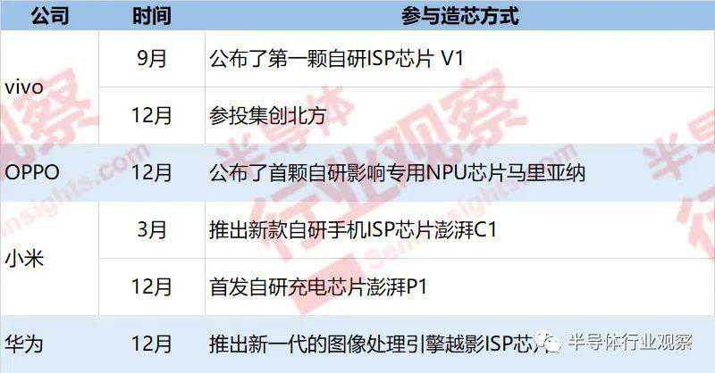 今年小米推出了2款芯片,分别是3月的ISP芯片澎湃C1和12月的充电芯片澎湃P1;vivo则公布了第一颗自研ISP芯片V1;OPPO推出首颗自研影响专用NPU芯片;华为海思也推出新一代的图像处理引擎越影ISP芯片。