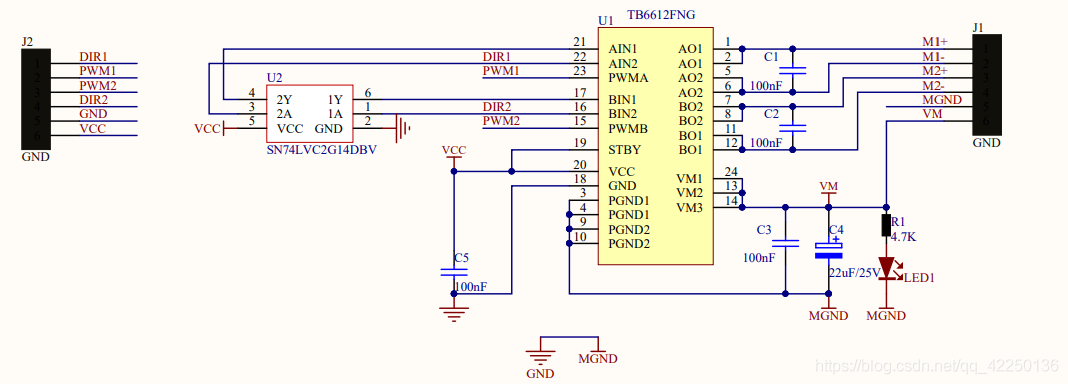 TB6612FNG是一款新型驱动器件,能独立双向控制2个直流电机,它具有很高的集成度,同时能提供足够的输出能力,运行性能和能耗方面也具有优势,因此在集成化、小型化的电机控制系统中,它可以作为理想的电机驱动器件。